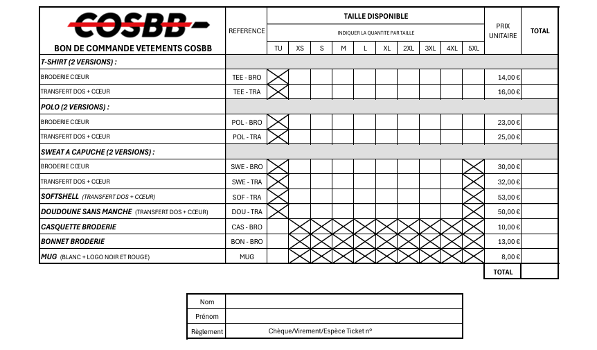 la boutique du club le déposer au bureau du club ACCOMPAGNÉ de votre RÈGLEMENT(Les produits apparaissent épuisé parce que la commande globale sera effectuée après le 31 décembre) Pour commander : imprimer le bon de commande Bon de commande T-Shirt À partir de 14,00 € En rupture de stock Polo À partir de 23,00 € En rupture de stock Sweat a capuche À partir de 30,00 € En rupture de stock Bonnet broderie 13,00 € En rupture de stock Casquette broderie 10,00 € En rupture de stock Softshell transfert cœur + dos 53,00 € En rupture de stock Doudoune sans manche (transfert cœur + dos) 50,00 € En rupture de stock Mug 8,00 € En rupture de stock